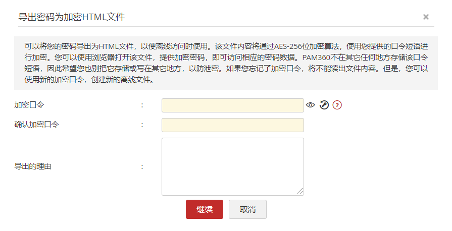 注意:PAM360不会将在系统中存储您导出文件是设置的密码短语,我们建议您也不要在任何地方存储或将其写下来。 如果您忘记了密码短语,则无法读取内容,但您可以重新导出一个离线文件。