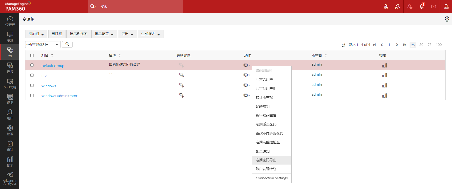 - 点击所需资源组的操作图标,然后从下拉列表中选择"定期密码导出"。