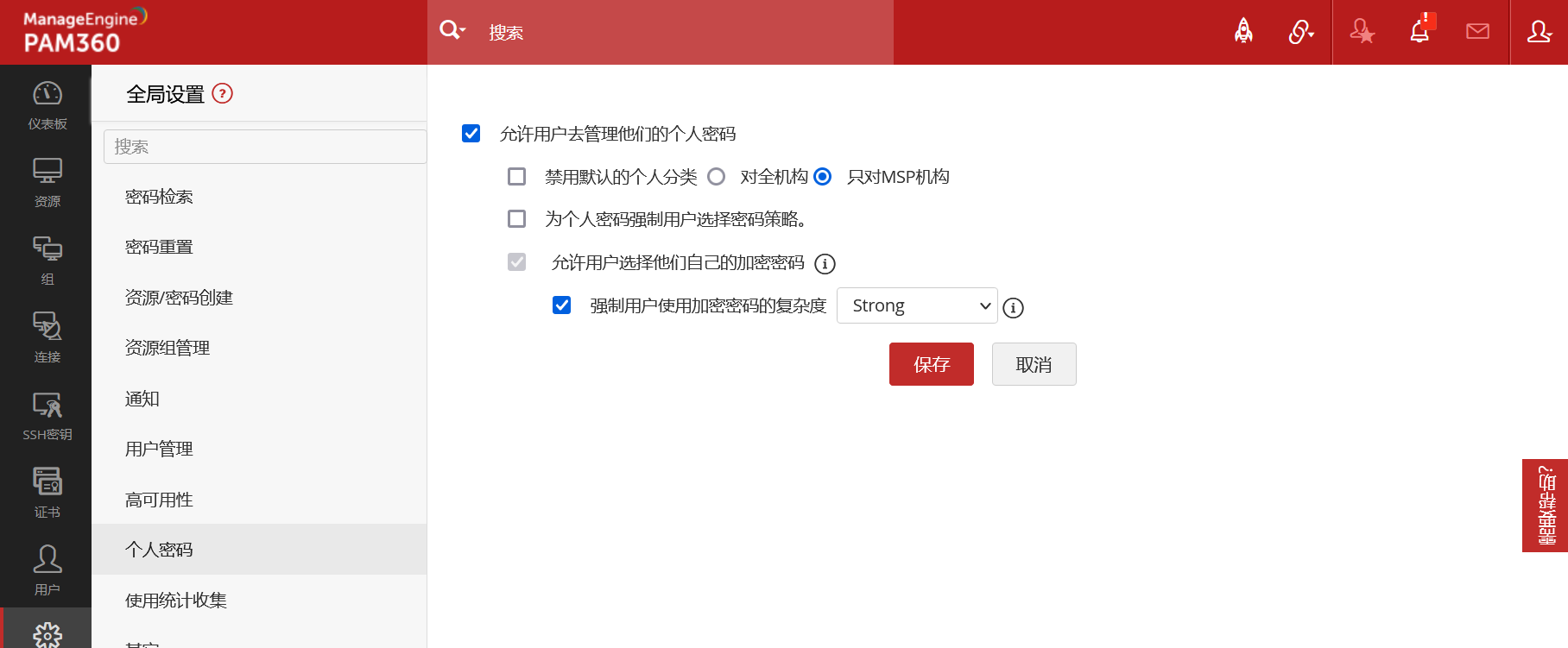 注意:在 PAM360 MSP 中,只有 MSP 管理员才能启用或禁用此选项。