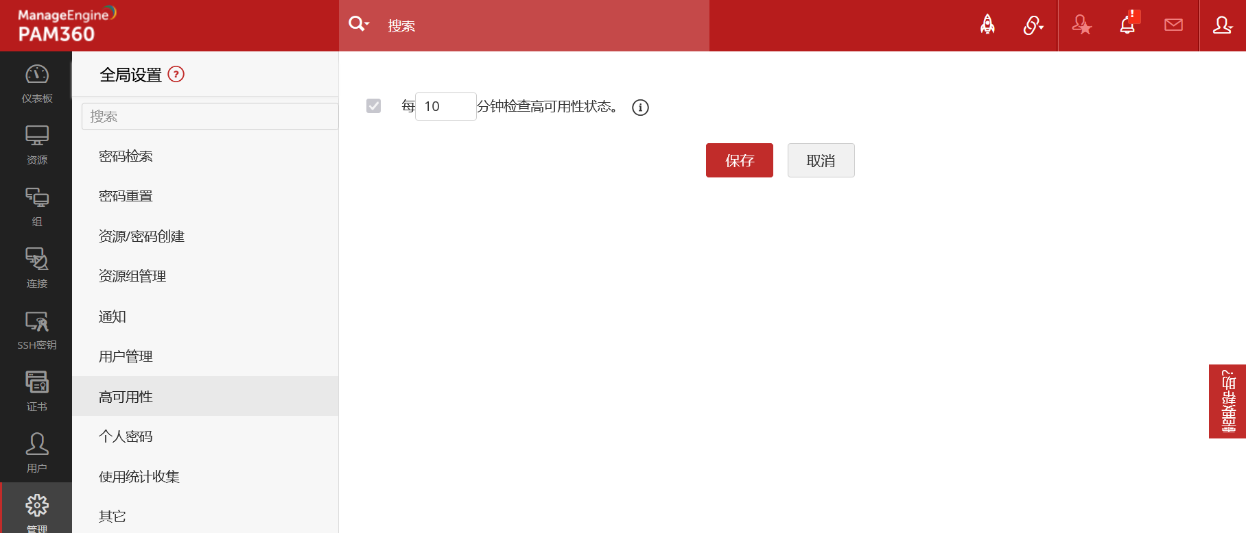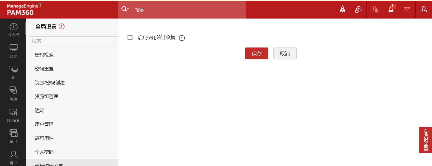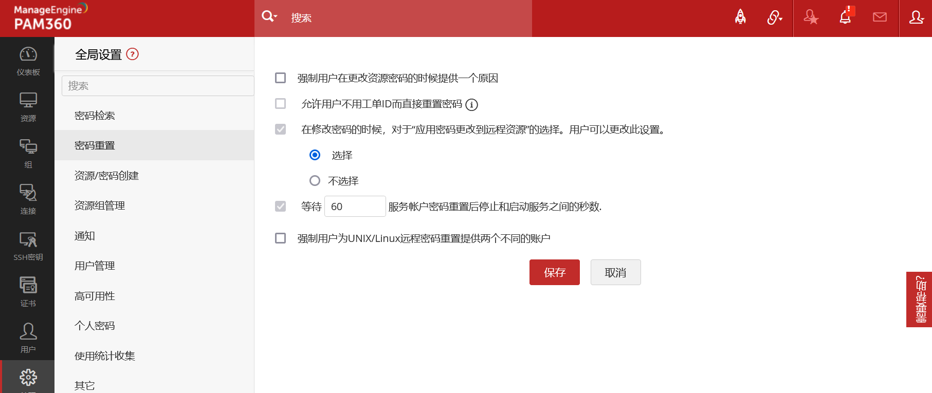若要查看和管理 PAM360 中与密码重置相关的所有全局设置,请单击左侧窗格中的密码重置。