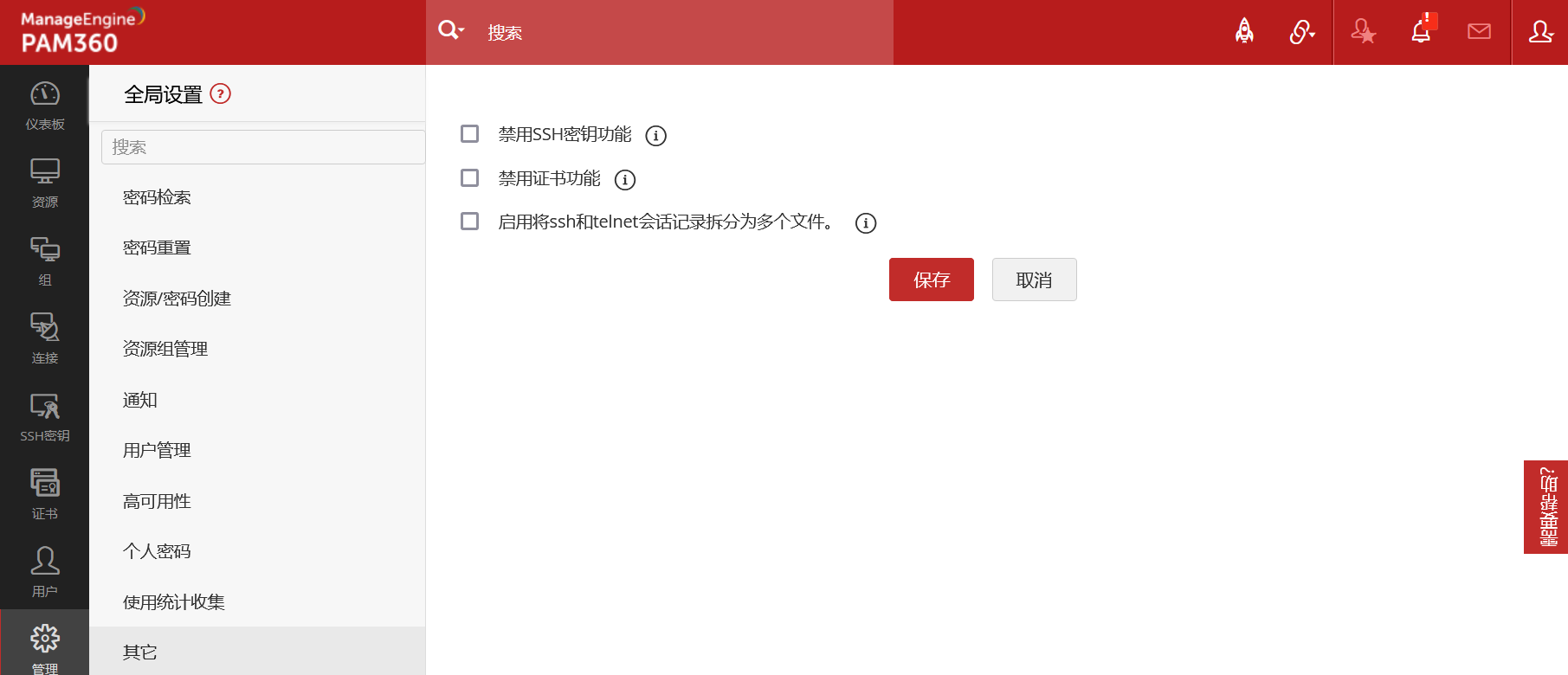 从左侧窗格单击"其它";本节包含可根据要求应用于 PAM360 的可选自定义项。