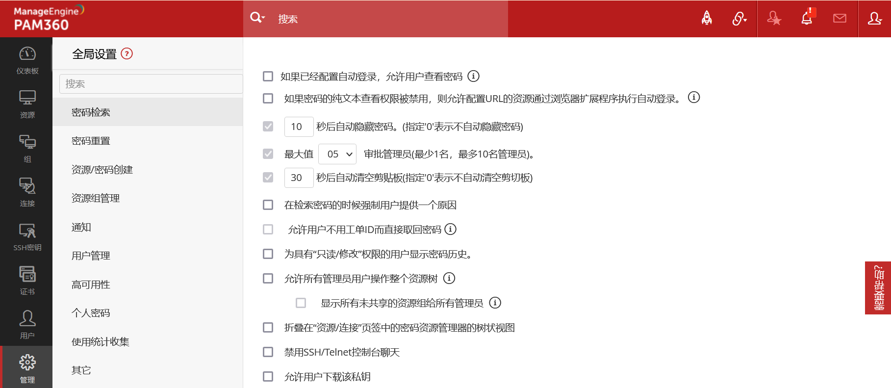 若要查看和管理与 PAM360 中的资源/密码创建相关的所有全局设置,请单击左侧窗格中的资源/密码创建。