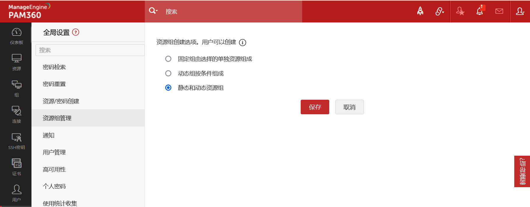 若要查看和管理 PAM360 中与资源组管理相关的所有全局设置,请单击左侧窗格中的资源组管理。