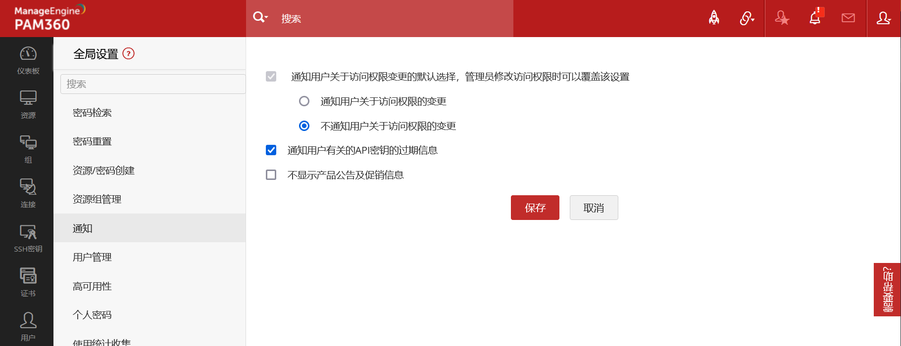 若要查看和管理与 PAM360 中的通知相关的所有全局设置,请单击左侧窗格中的"通知"。