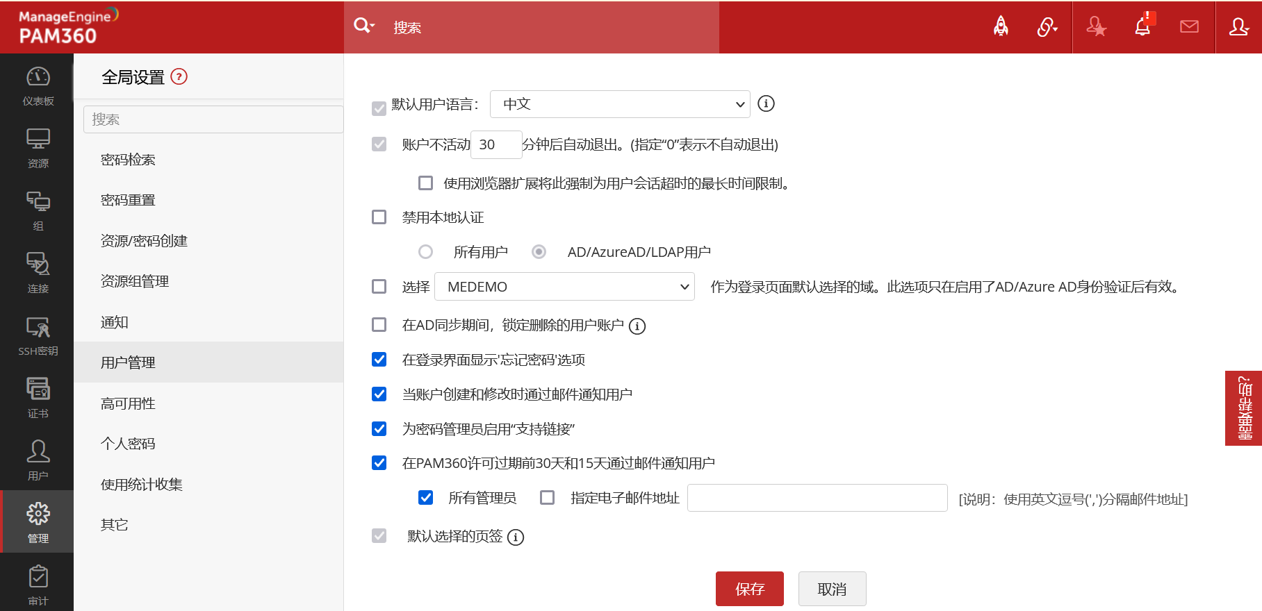 若要查看和管理 PAM360 中与用户管理相关的所有全局设置,请单击左侧窗格中的用户管理。