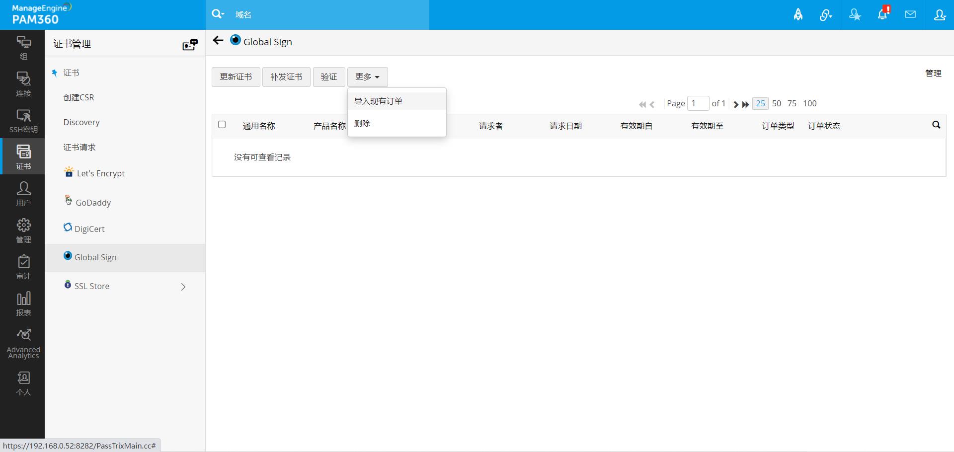 注意: PAM360允许您从GlobalSign导入帐户中现有证书订单,并跟踪其状态。从顶部菜单栏的更多选项中,选择导入现有订单,将现有的未完成订单导入PAM360。