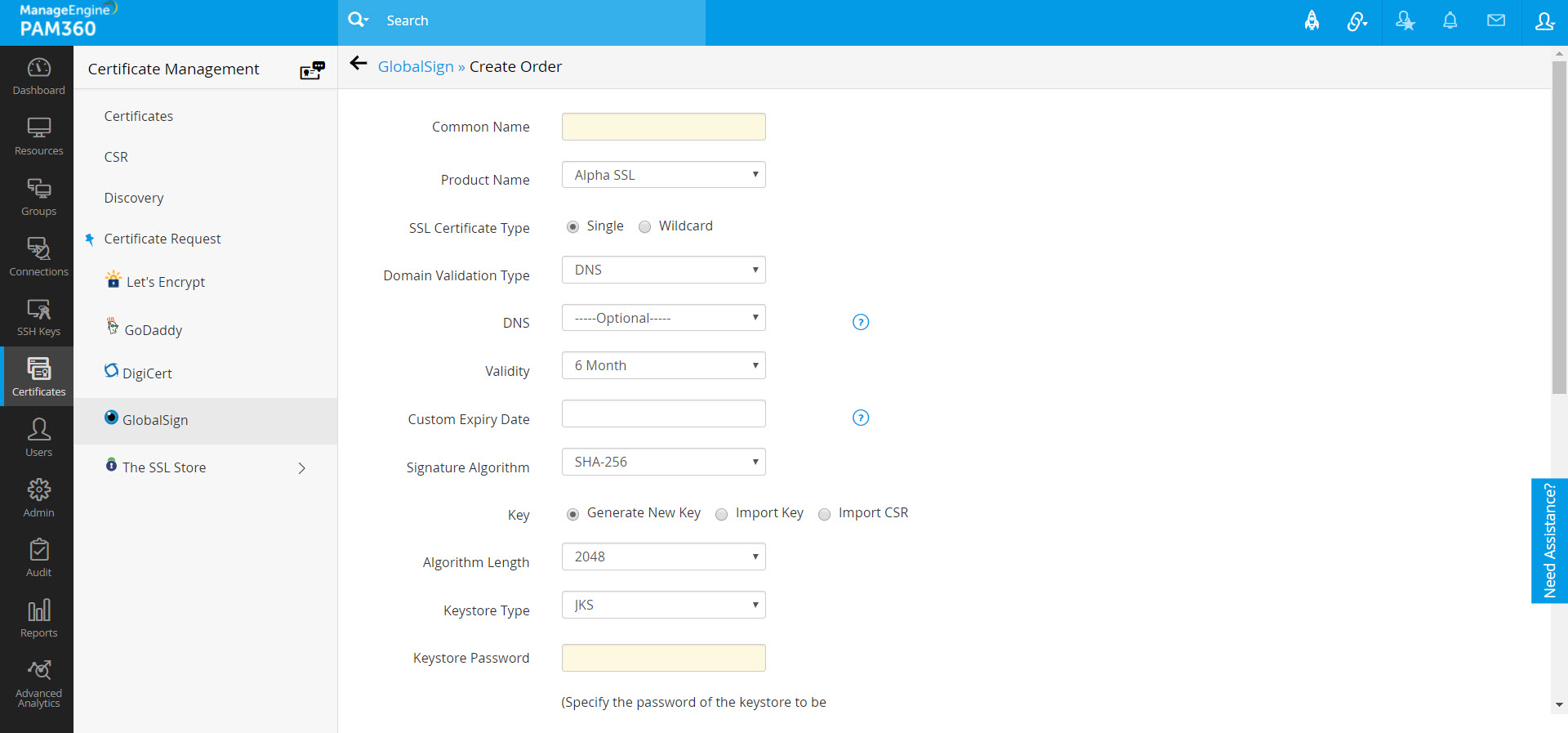 按照以下步骤将GlobalSign帐户添加到PAM360中: