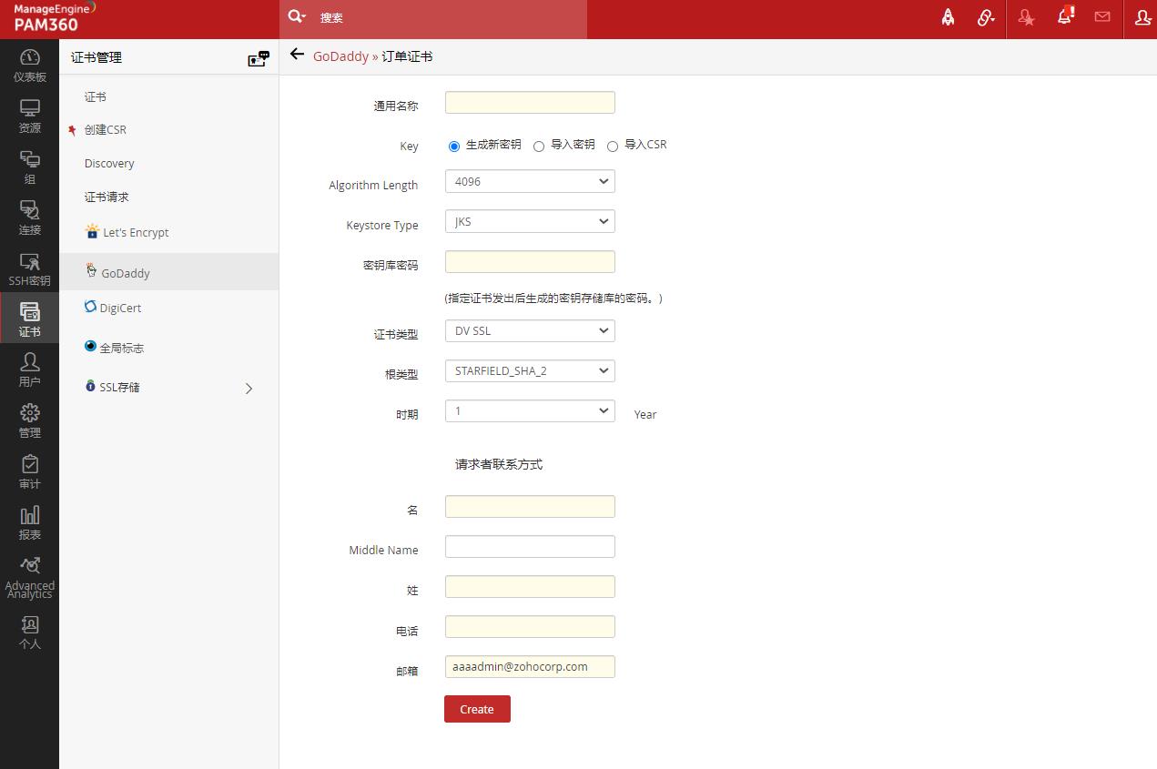 注意:从 PAM360 发出证书请求时,您只能提出与从 GoDaddy 购买的证书设置数量一样的请求。