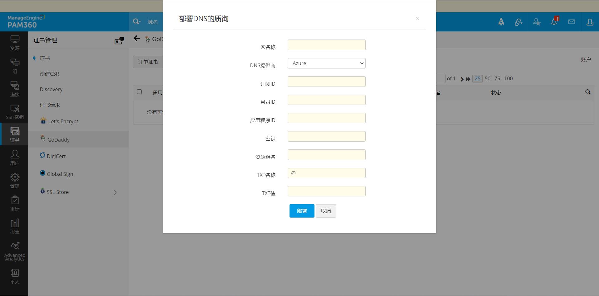 - 对于通过基于DNS的质询验证进行的域验证,您可以配置DNS详细信息(仅支持Azure和Cloudflare DNS),并使用“部署DNS质询”选项直接从PAM360部署质询ID。