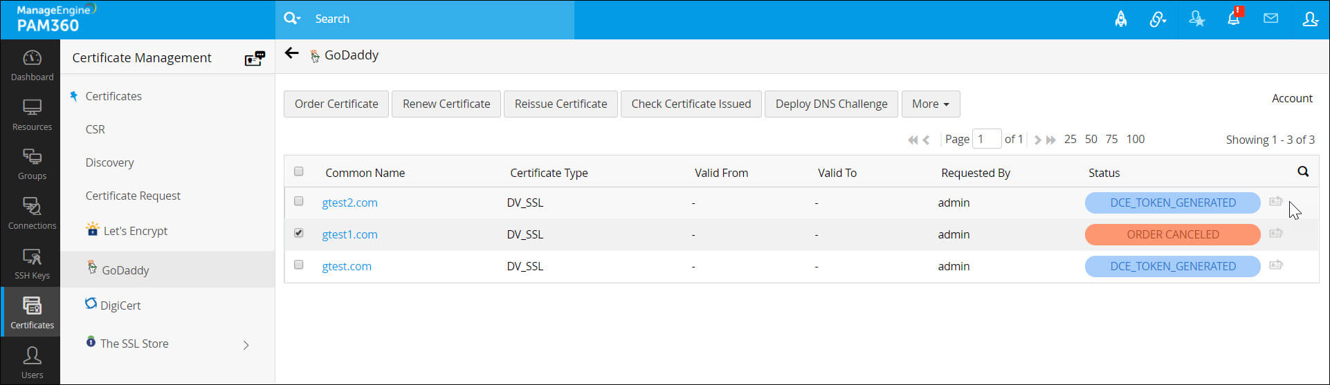 - 验证成功后,GoDaddy将颁发证书并将其自动添加到PAM360的证书库中。