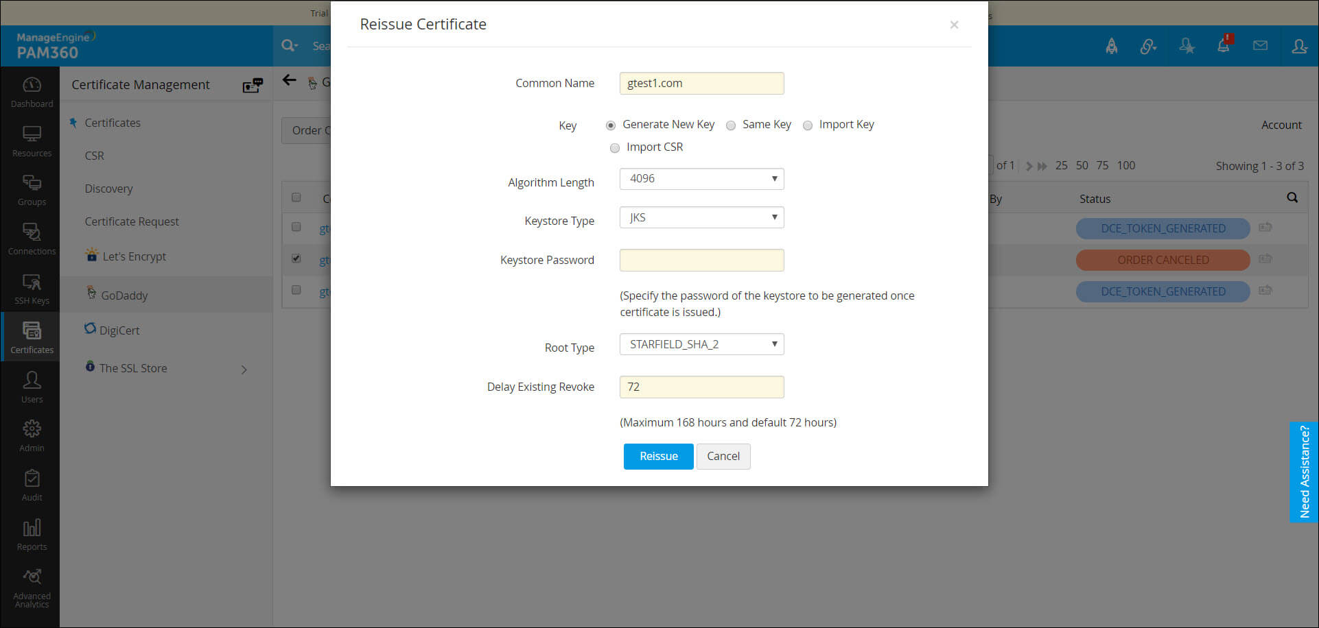 您可以在PAM360中续订、撤销或请求重新签发证书,或取消证书订单。