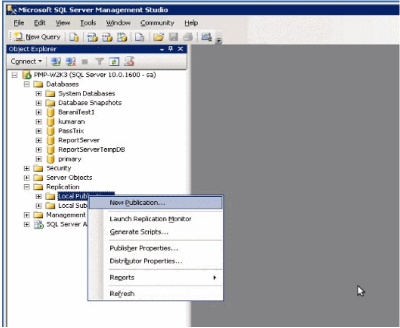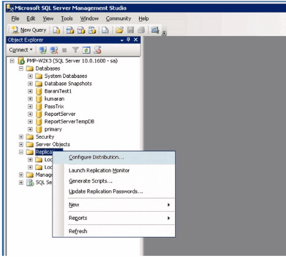 1.在对象资源管理器下,右键单击复制并单击配置分发服务器。