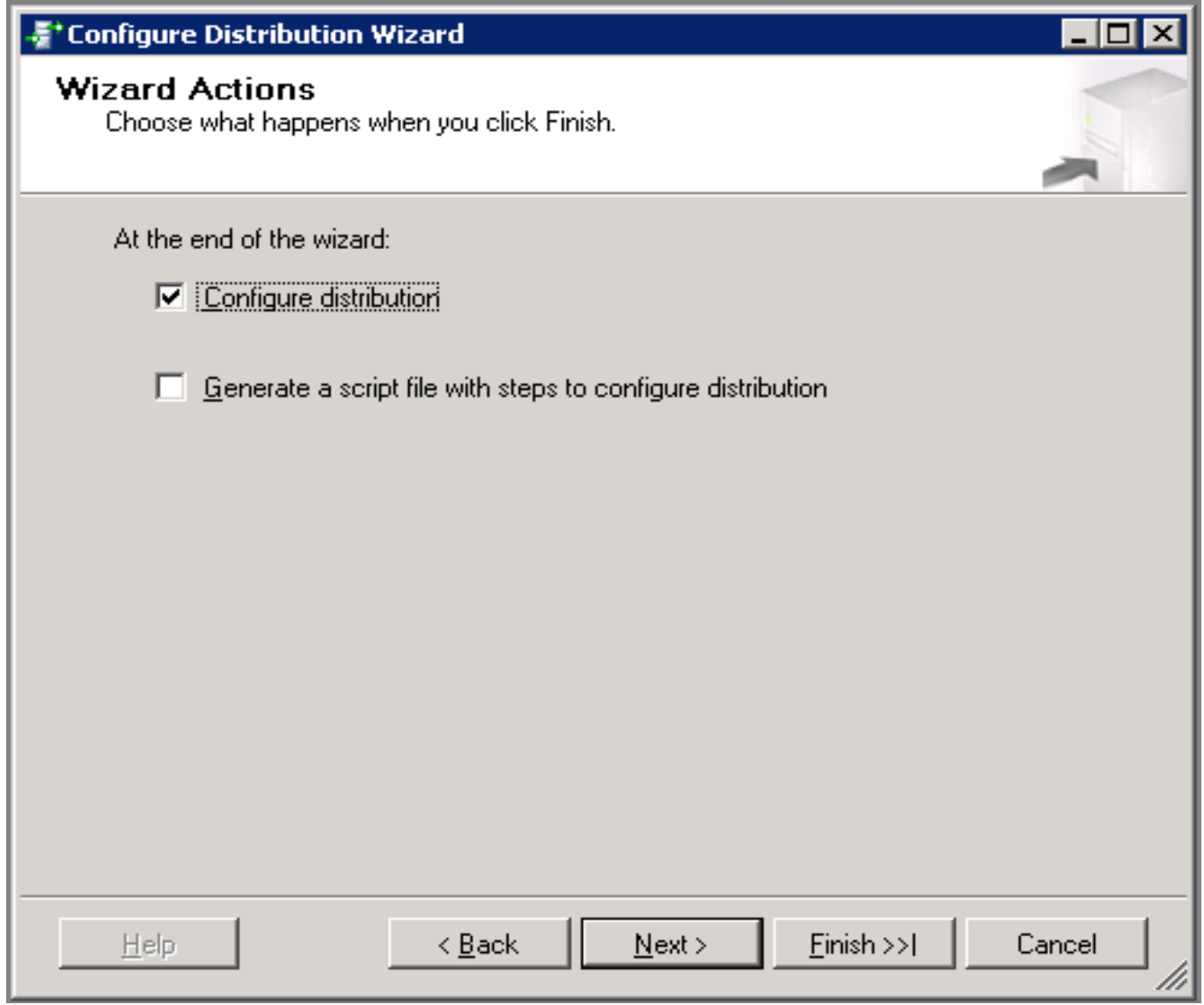 6.选择退出此向导时希望发生的情况。 您可以选择配置分发或生成脚本文件,也可以同时选择两者。 单击下一步。