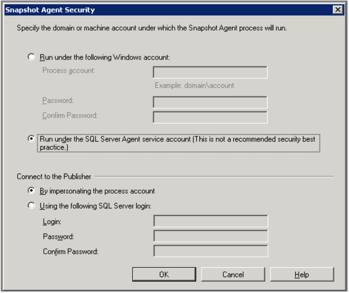 10.这是您选择域或计算机帐户,即用于运行快照代理的账户。 选择"在SQL Server 代理服务帐户下运行"。 此外,选择方法通过模拟进程帐户连接到发布者。单击确定。