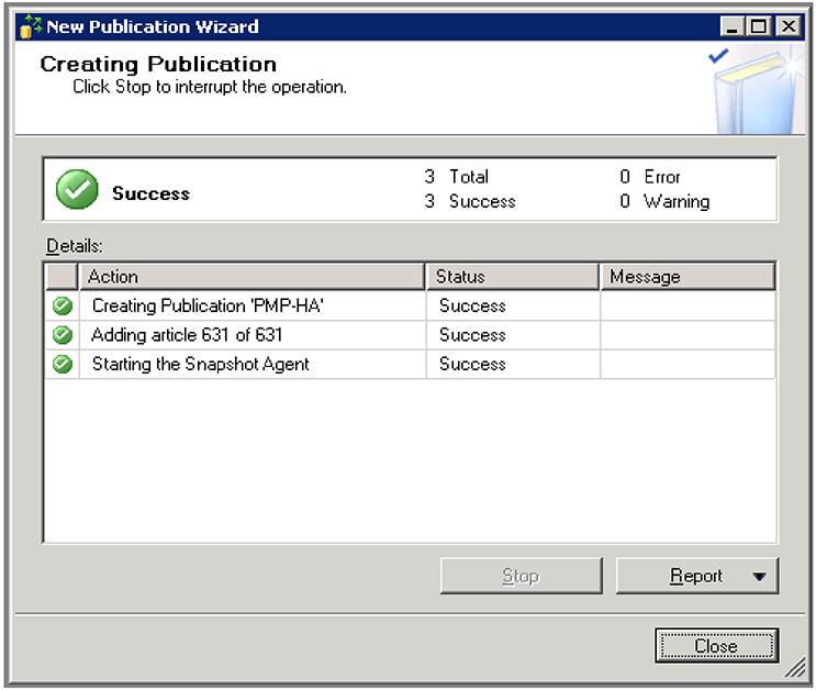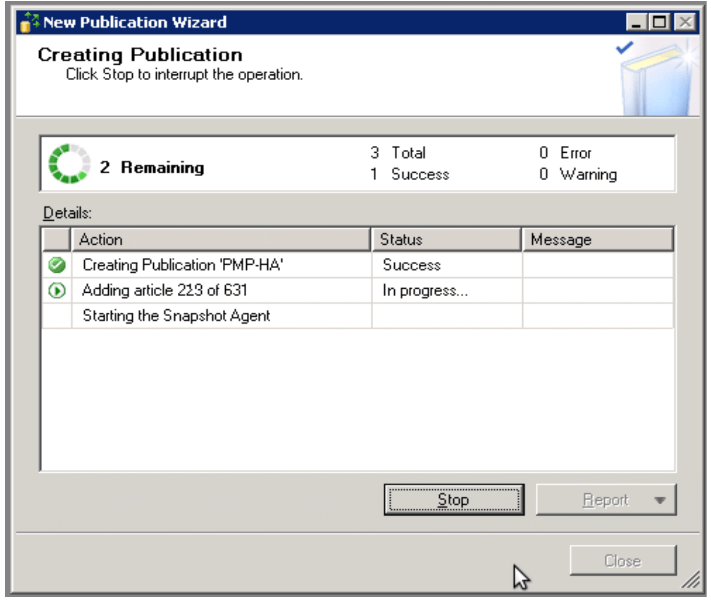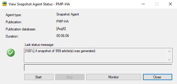 右键单击发布并单击查看快照代理状态 。 您将看到下面的窗口,显示快照创建进度,此过程需要几分钟时间。成功生成快照后关闭窗口。 您也可以通过单击相应的按钮启动代理或监视代理。