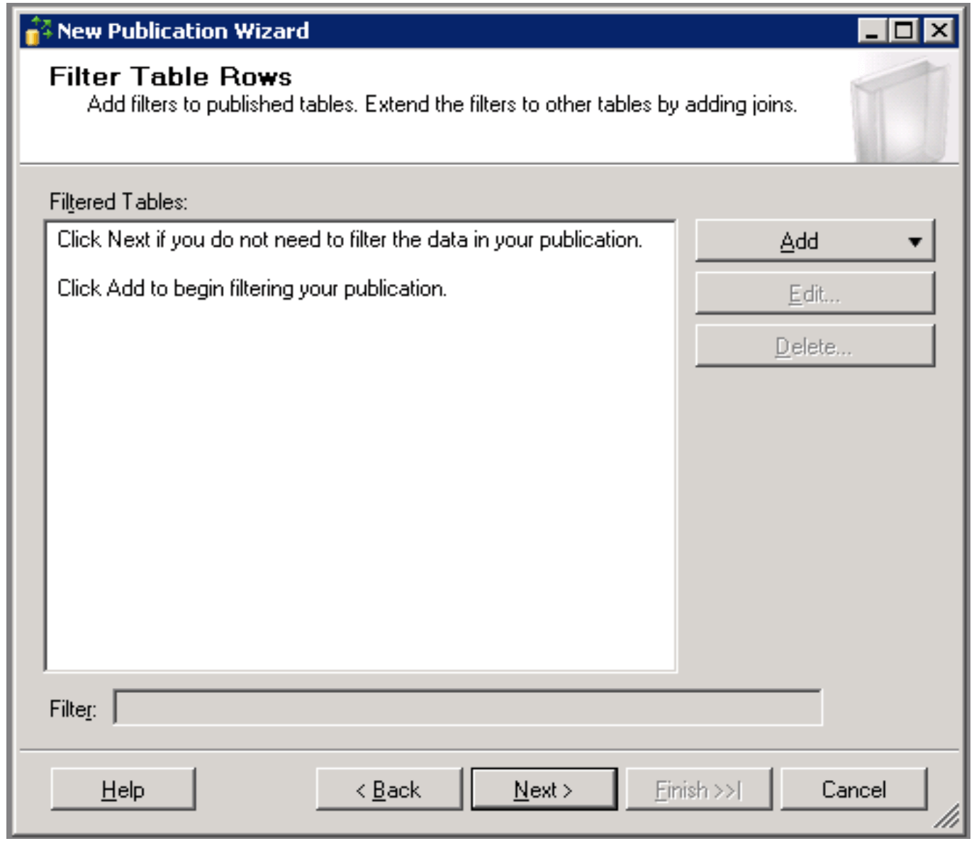 7.此步骤允许您筛选表行。单击添加开始向发布添加过滤器,如果不想筛选应用程序中的数据,单击下一步。