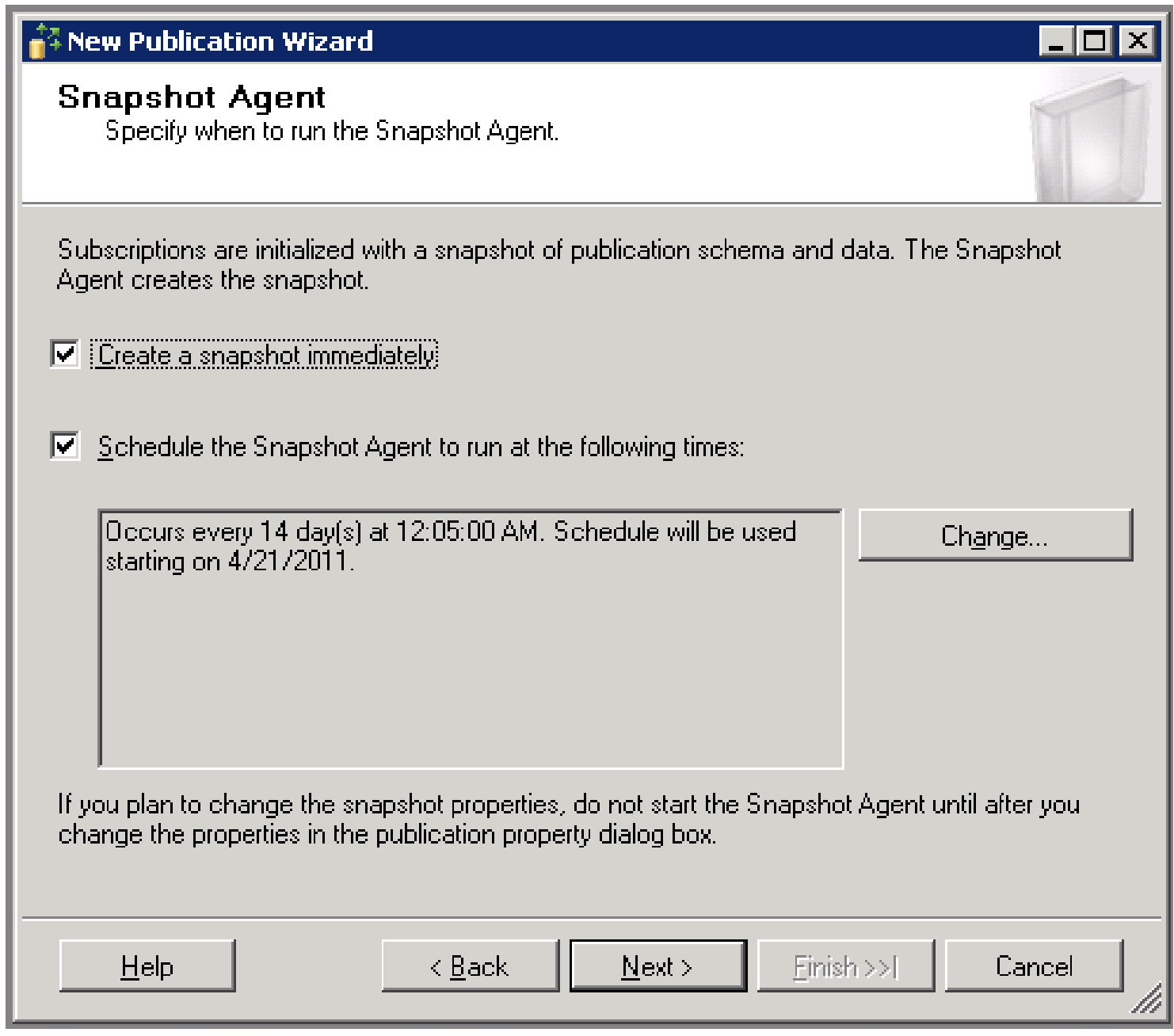8.选择是按时间运行快照代理,还是安排代理在指定的日/时间运行。单击下一步。