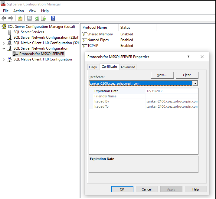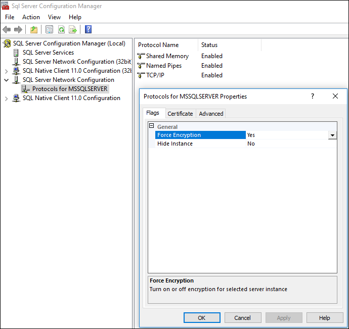 在工具的左侧窗格中,而不是右侧窗格中的特定协议。 - 在证书选项卡上,配置数据库引擎以使用证书。