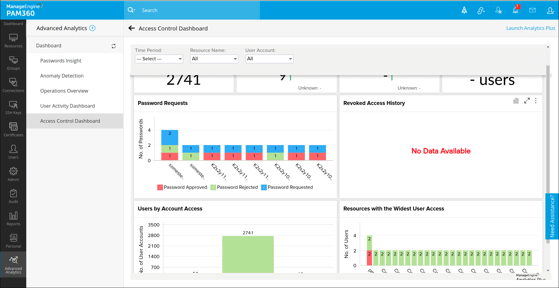 PAM360 的Analytics Plus模块通过 ManageEngine Analytics Plus 提供,自动分析特权帐户活动数据,以帮助您识别密码和用户帐户活动中的异常。
