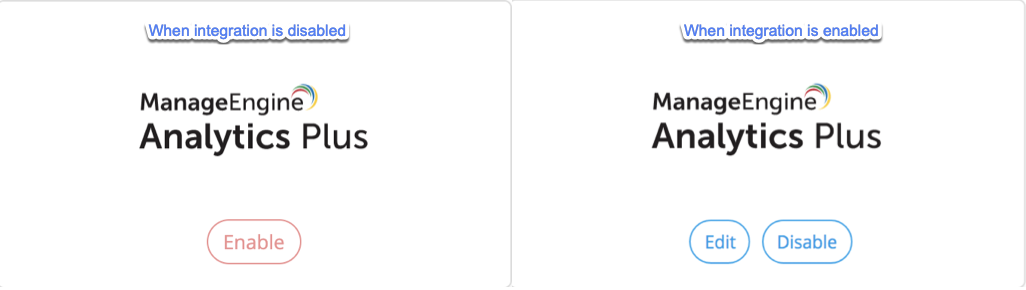 在集成ManageEngine页面,您将看到Analytics Plus,该模块根据集成是启用还是禁用,如下所示以下任何图像: