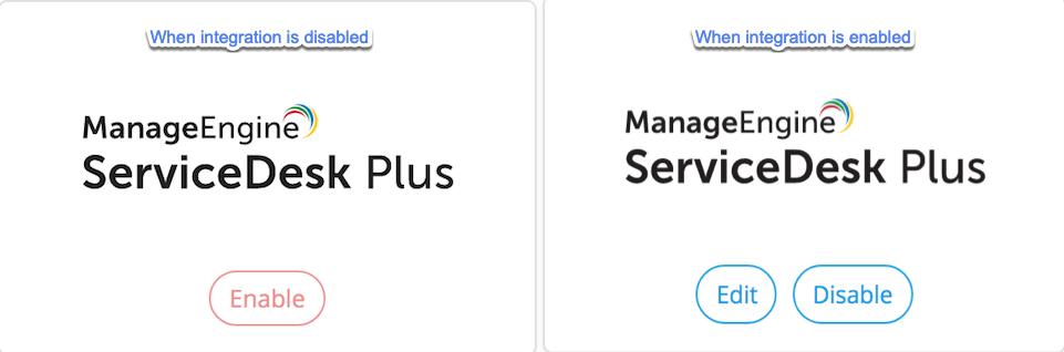 在集成 ManageEngine页面,您会看到ServiceDesk Plus,该块根据集成是启用还是禁用,如下所示任何图像: