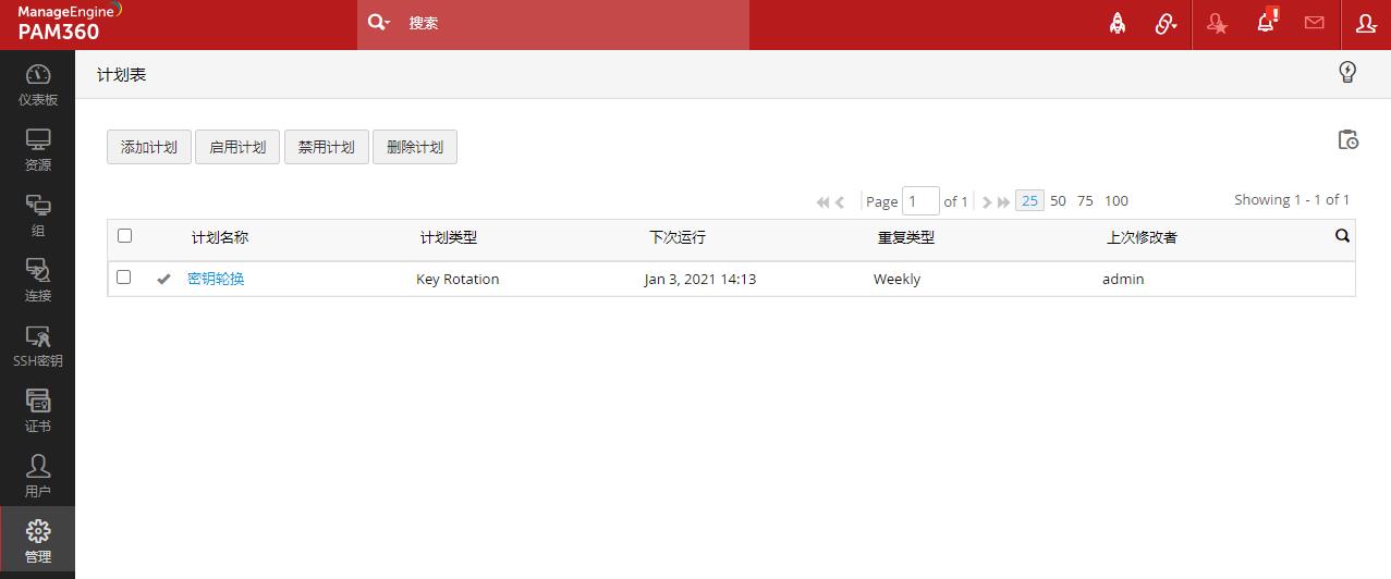 - 计划选项卡包含与 PAM360 中创建的各种计划任务相关的审计跟踪,包括计划的密钥轮换和发现任务以及报表生成等操作。 查看此内容,请导航到管理 >> SSH/SSL >> 计划单击选项卡右上角的"计划审计"图标。您甚至可以细化任务执行结果。