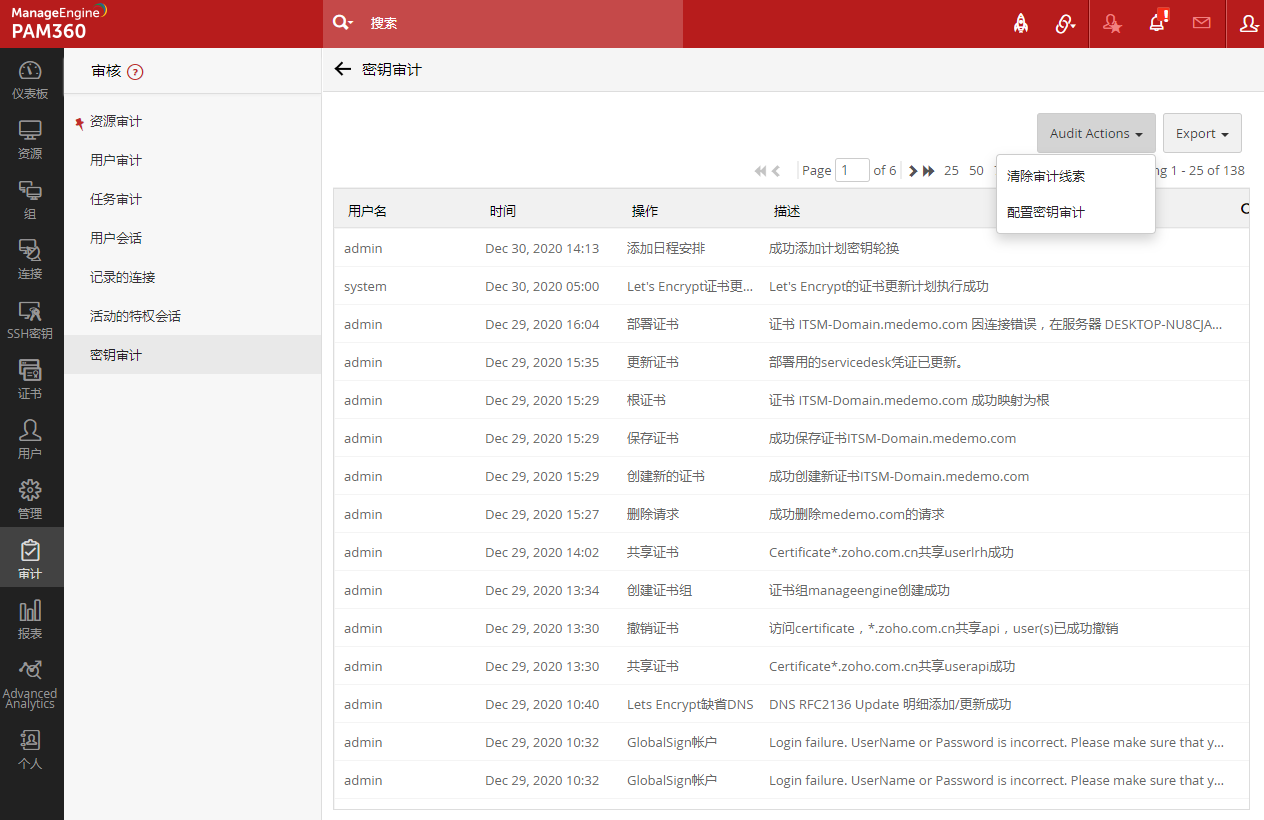 PAM360具有有效的审计机制,该机制可以记录产品中执行的所有活动。审计跟踪捕获有关“谁”执行“什么”操作以及“何时”执行的信息。PAM360中的密码用户只能查看其操作的审计记录,而管理员可以查看与所有用户有关的审计记录。