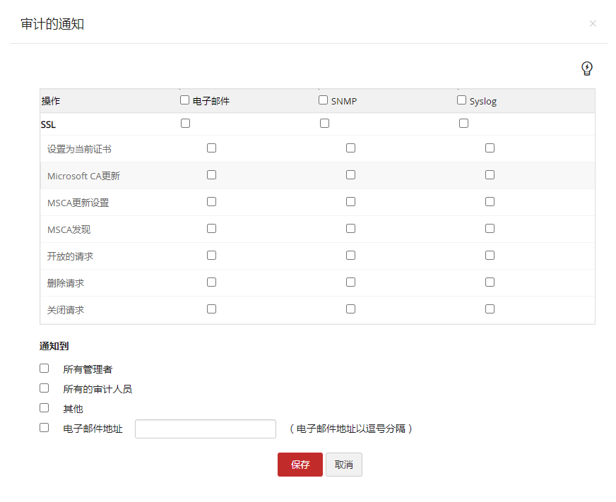 您可以通过导航到审计 >> 密钥审计 >> 审计操作 >> 配置密钥审计,在 PAM360 中执行的密钥审计操作发送通知。这里,您可以选择电子邮件、 SNMP陷阱或 Syslog 来发送通知。 您可以选择要为哪些与密钥相关的操作创建通知提醒,并将其通知发送给所有管理员、所有审计员或特定用户和用户组。