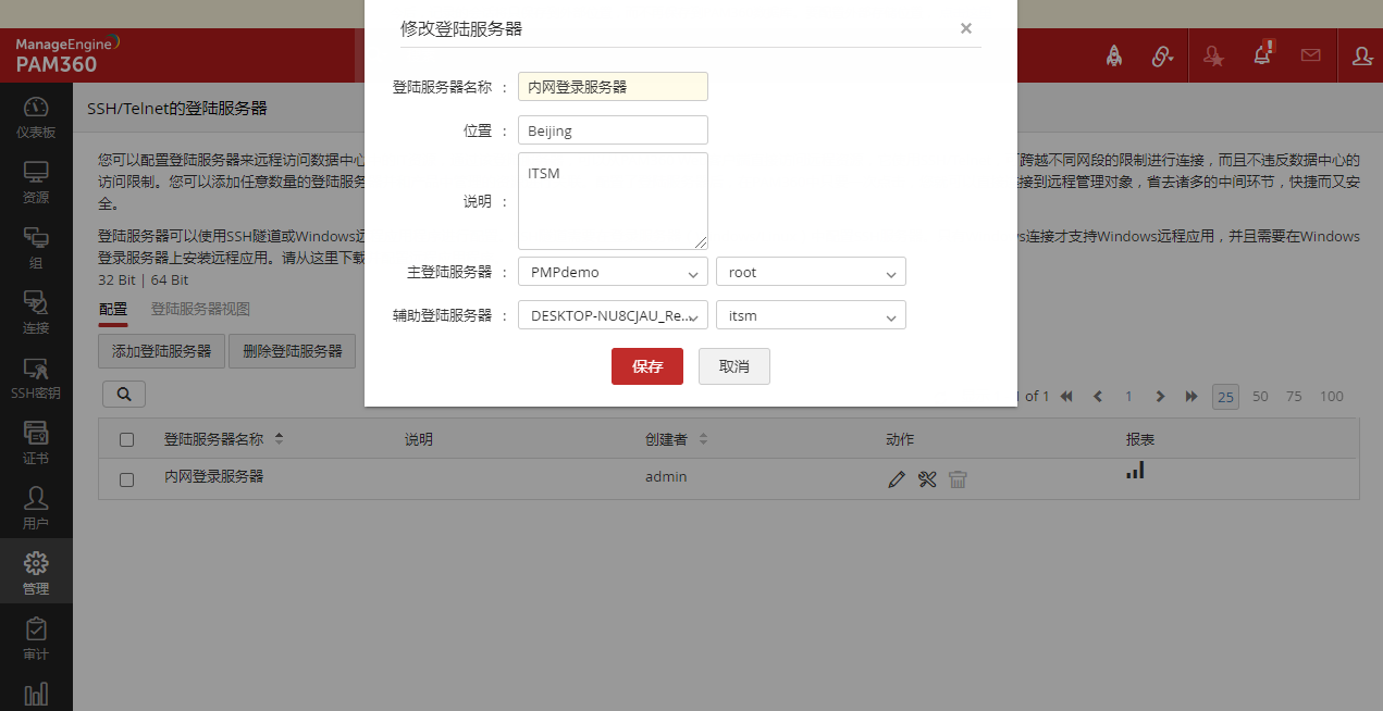登陆服务器也是PAM360中的资源。数据中心远程访问首先要与登陆服务器建立连接。因此,第一步是通过资源添加过程将所需的登陆服务器添加为PAM360中的资源。登陆服务器通常具有主辅设置。将主服务器和辅助服务器都添加为资源。