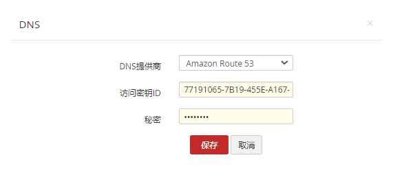 - 对于与 AWS 账户关联的 Amazon Route 53 DNS ,输入访问密钥ID和密钥。