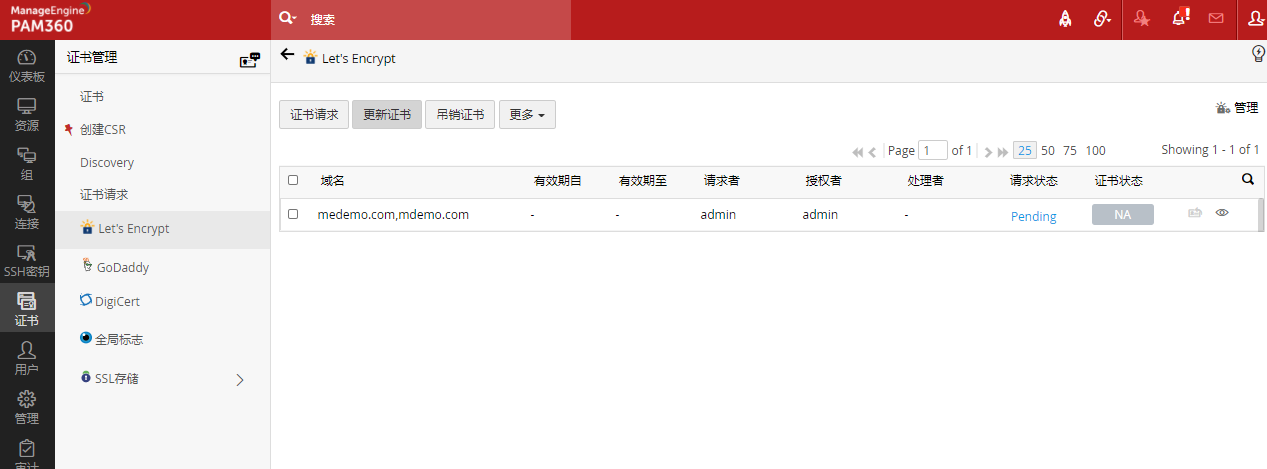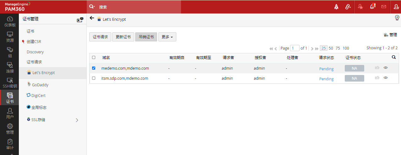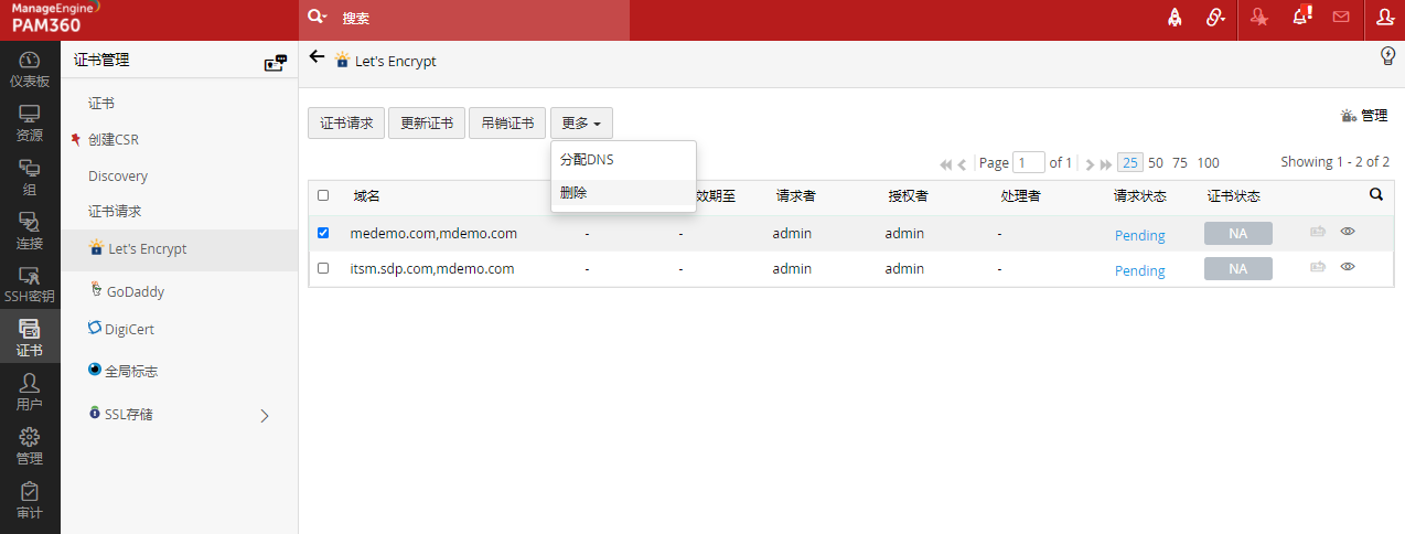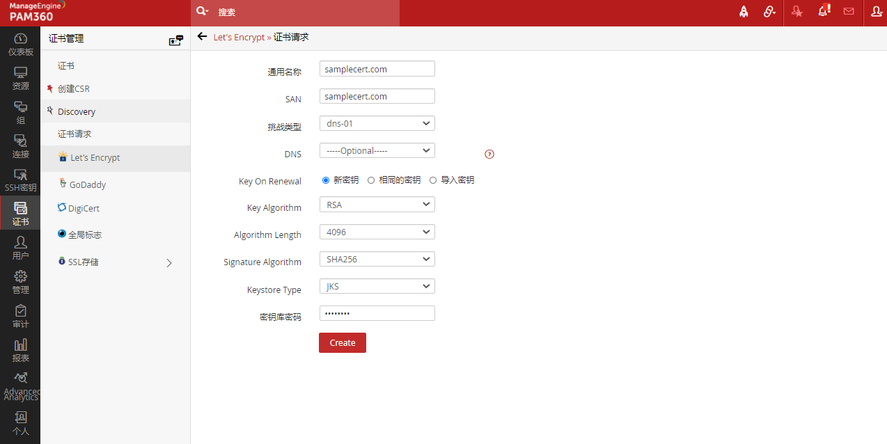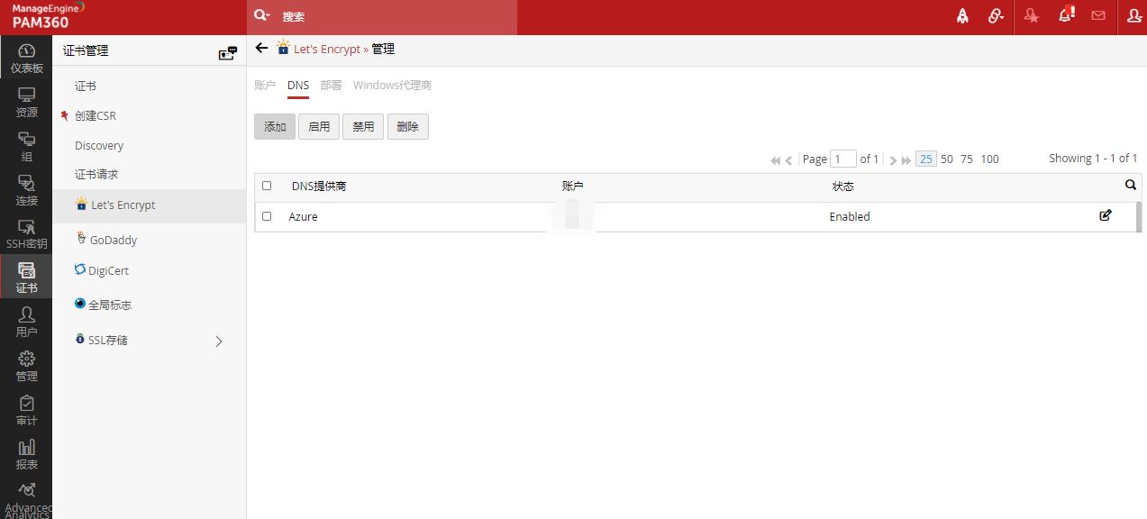 注意:此权限仅对管理员用户可用,并且只能从 PAM360 创建一个"Let's Encrypt"帐户。