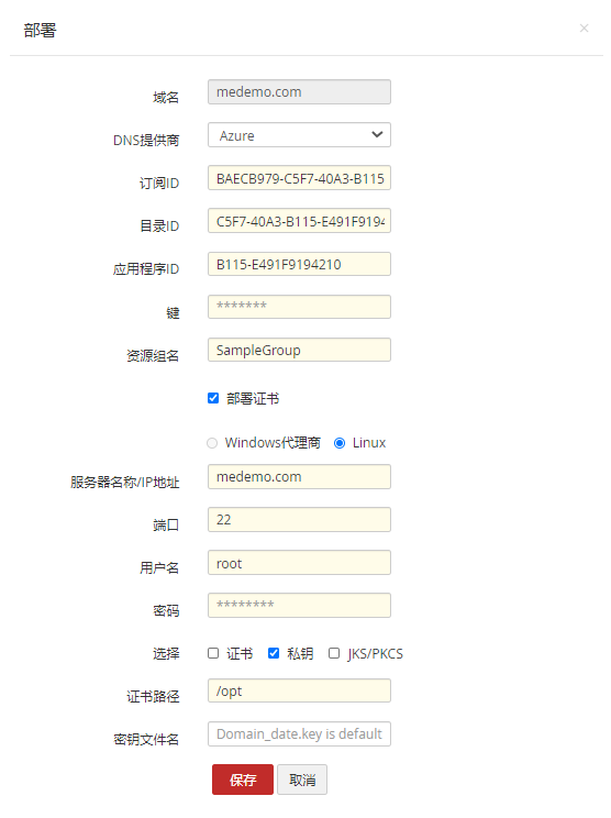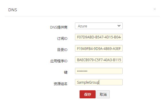 - 选择您的 DNS 提供商。 对于 Azure DNS ,提供所需的详细信息 订阅 ID、目录 ID、应用程序 ID、应用程序密钥和资源组名称。