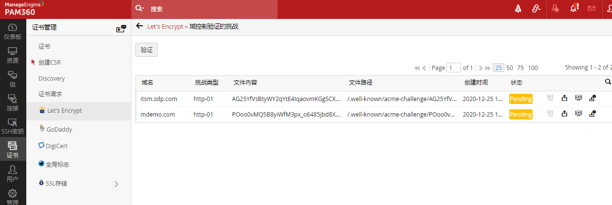 - 质询的处理也可以在没有自动化的情况下手动完成。手动将质询值/文本记录复制并粘贴到域服务器中。然后在PAM360服务器中,导航到“待处理的请求”页面,然后单击“验证”。质询通过验证后会颁发证书。