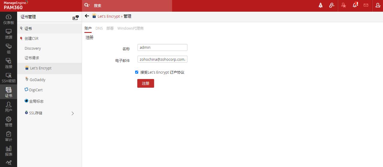 向Let's Encrypt CA请求证书的第一步是使用Let's Encrypt创建一个帐户。这是一次性的过程,可以通过PAM360界面完成。