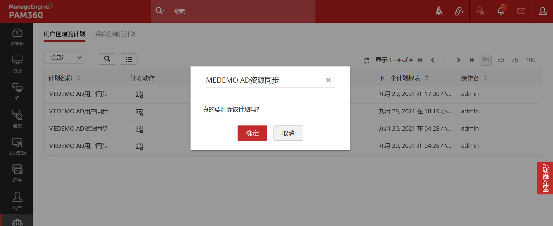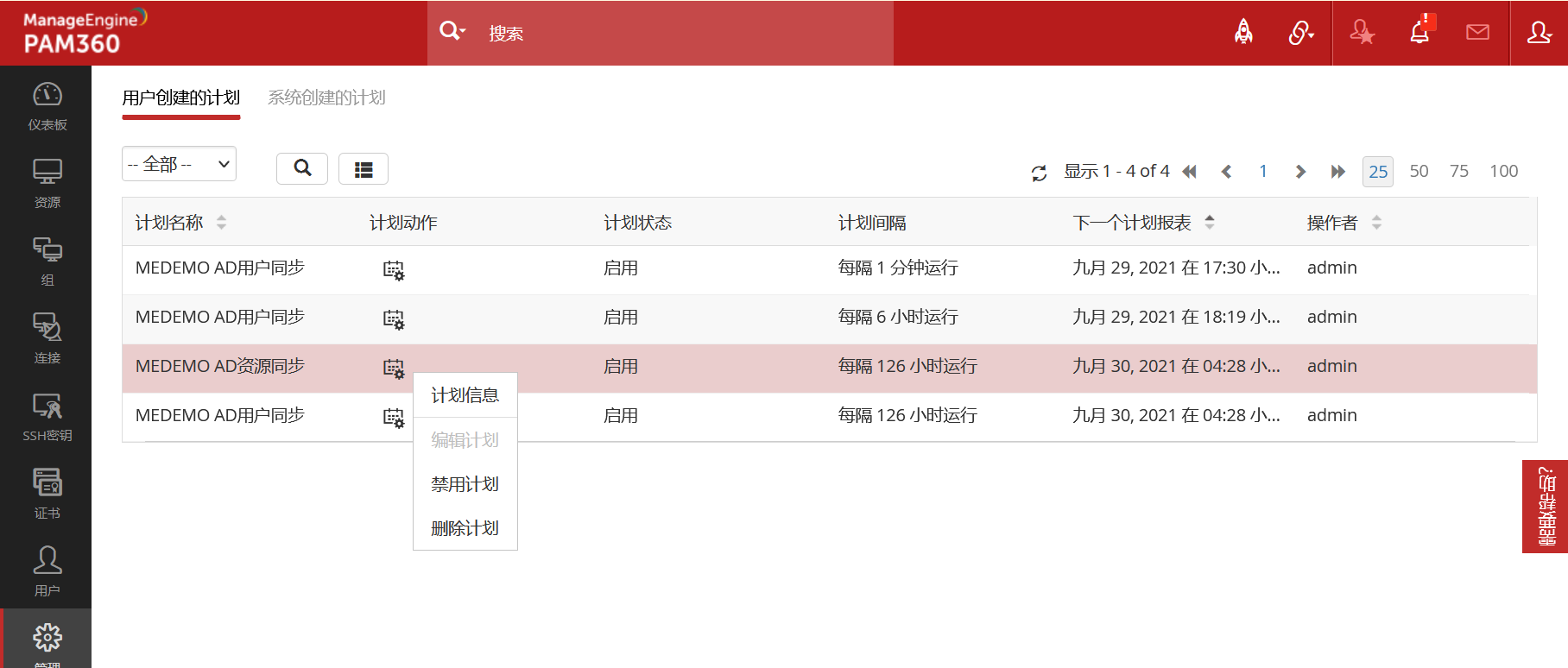 PAM360为您提供了管理计划功能,让您可以快速的查看、编辑用户或系统创建的计划。帮助IT管理员轻松的管理所有计划。用户也可以从这里启用、禁用或删除计划。
