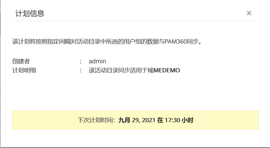- 您现在可以查看计划的详细信息, 计划内容、创建者、选择的组和下次计划时间。