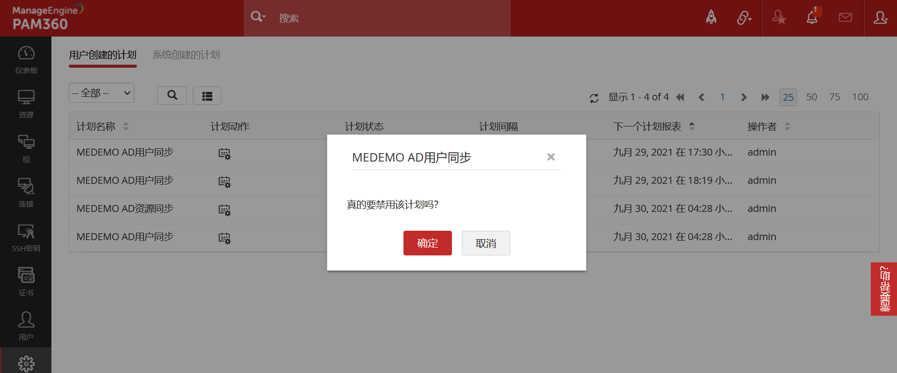 使用此选项,您可以启用或禁用任何用户创建的计划。此选项不适用于系统创建的计划。 但是,您可以禁用系统创建的密码同步计划。