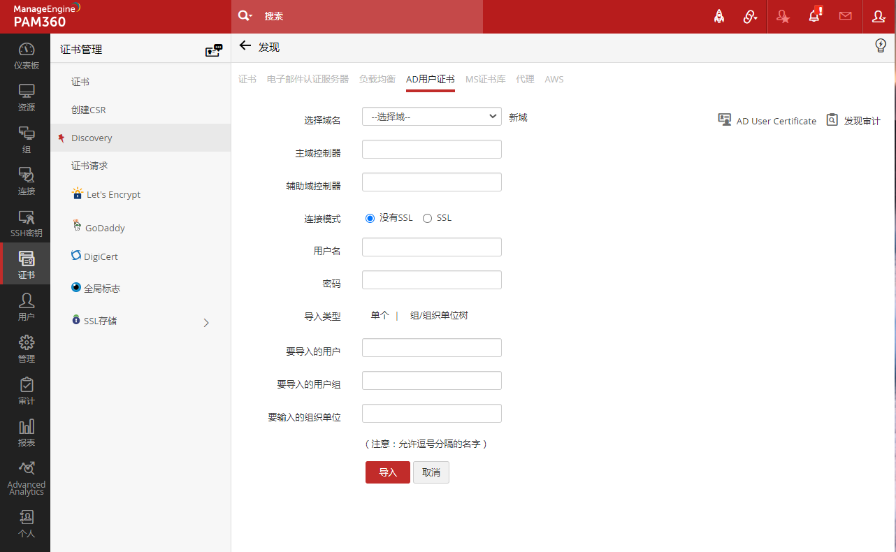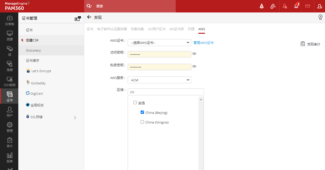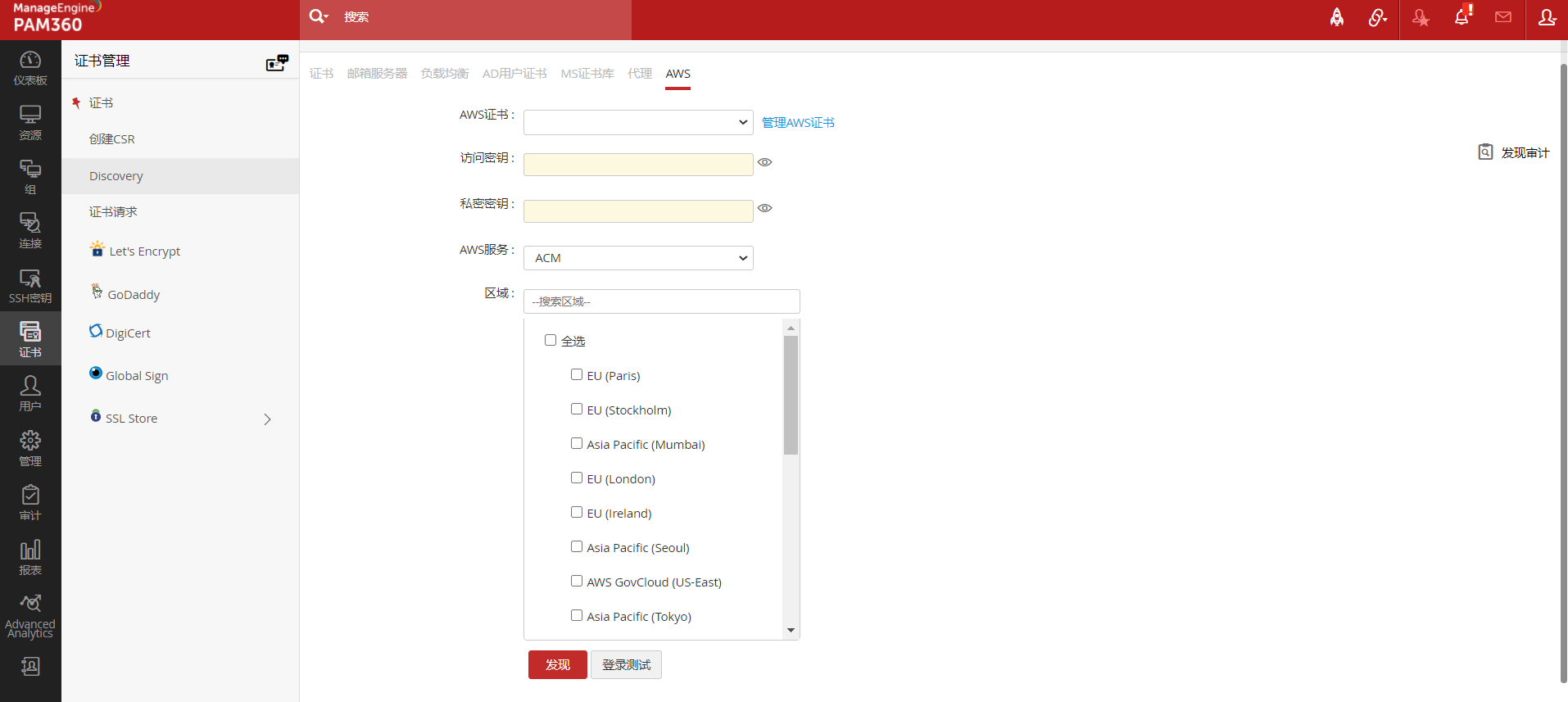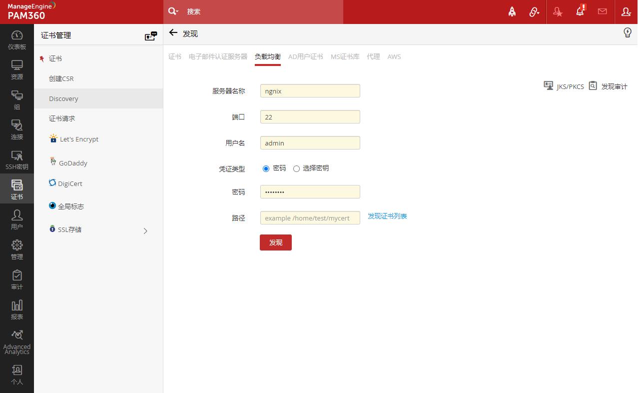 PAM360允许您发现部署到负载均衡器上的 SSL 证书,在PAM360安全存储。目前,PAM360 支持基于 Linux 的负载均衡器(即 Nginx 、F5 等)进行证书发现,通过 SSH 协议实现。操作如下: