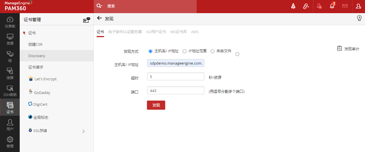- 主机名/IP地址: 输入需要发现证书的服务器名称或 IP 地址。