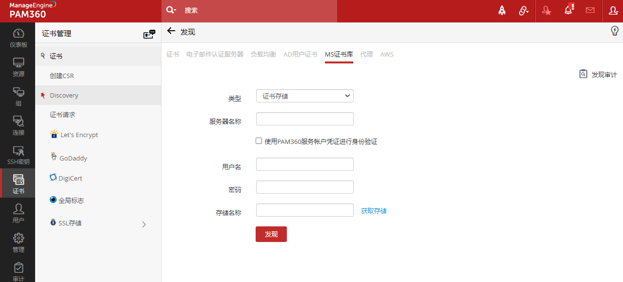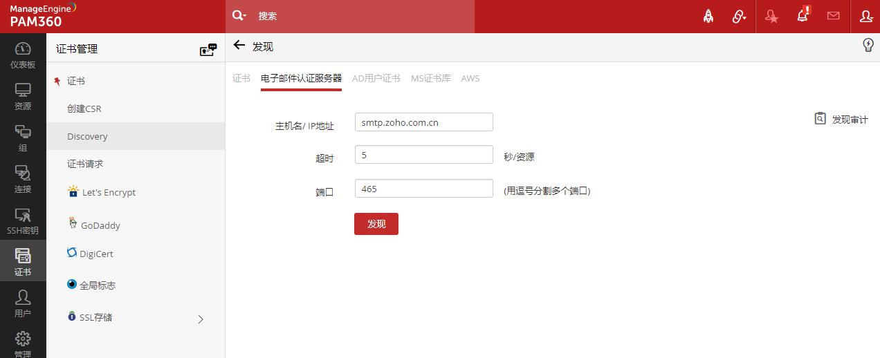 您可以发现邮件服务器使用的 SSL 证书,并将它们添加到 PAM360 的证书存储库中。邮件服务器证书发现操作如下: