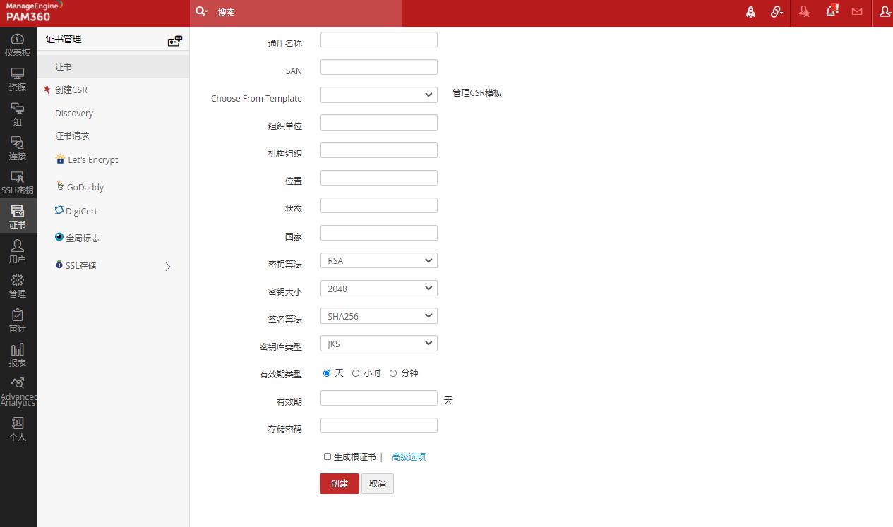 您还可以在创建证书时,启用生成根证书复选框,通过PAM360生成新的CA根证书。