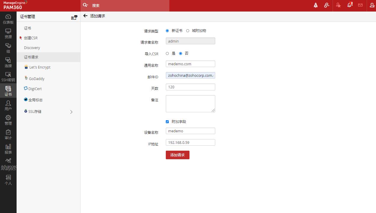 要将请求添加新证书或将子域添加到现有证书中,请在PAM360中操作: