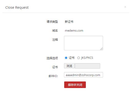 - 在“关闭请求”窗口中,可添加注释以及申请的证书文件,指定要将证书发送给的用户的电子邮件ID,然后单击“保存并关闭”按钮。单击按钮后,请求将自动移至“关闭”状态。