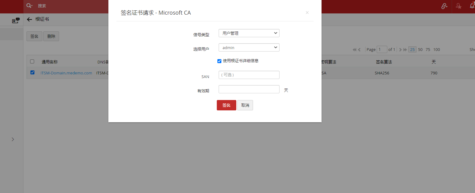 - 选择所需的CA根证书,然后单击“签名”。在打开的弹出窗口中,选择签名类型,以及需要生成和签名证书的目的用户/用户组,可选设置SAN,以及有效期(天)。