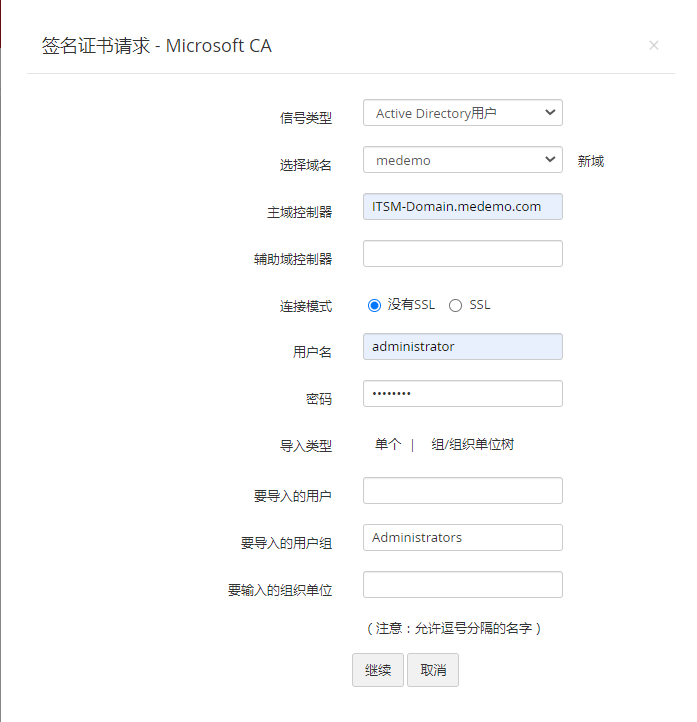 - 选择“单个导入类型” 并指定用户、或用户组,或使用“组/组织单元"导入类型来选择需要为其创建证书的用户或用户组。
