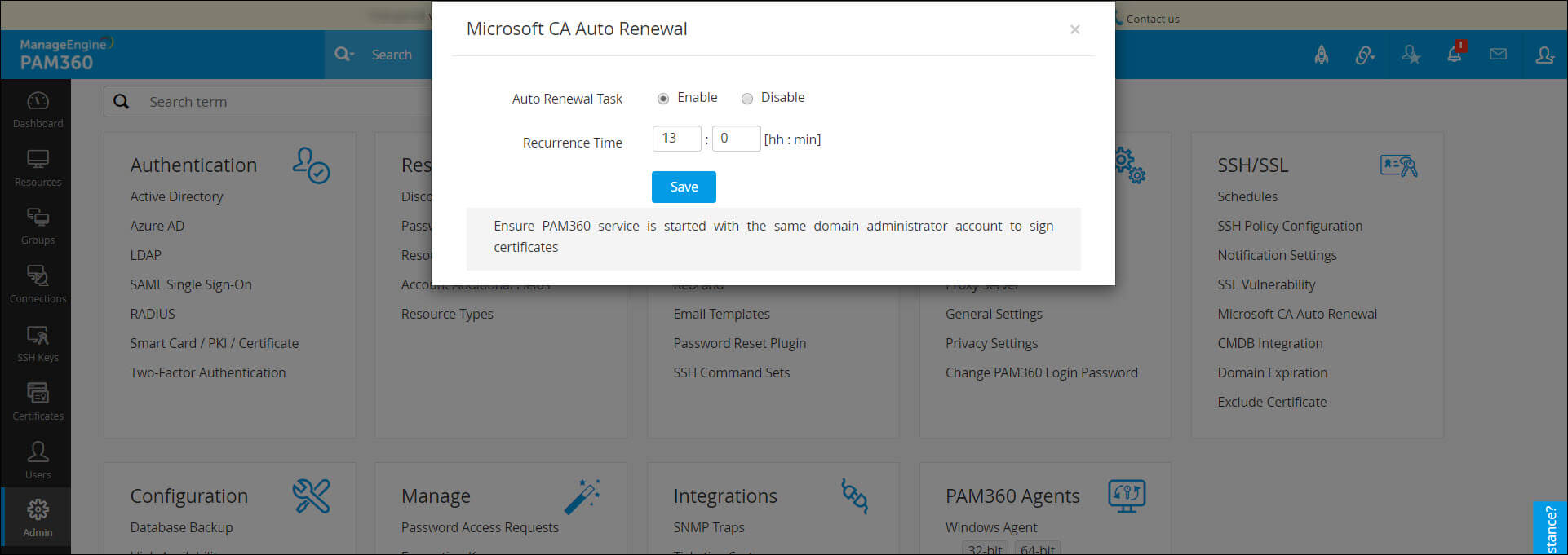 本地 CA 颁发的证书可以从 PAM360 自动续订。