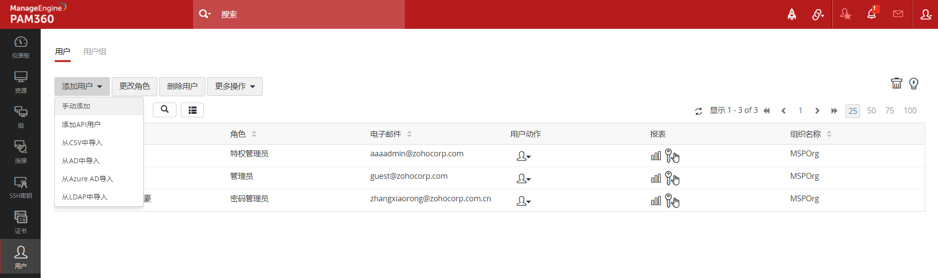 PAM360支持管理员手动添加用户,并根据用户所需的访问级别为其分配不同的用户角色。 创建用户后,用户将收到一封电子邮件,其中包含其帐户和登录凭据的详细信息。 管理员在手动添加用户时,还可以根据组织的要求定制访问级别和个人首选项(如GUI语言)。