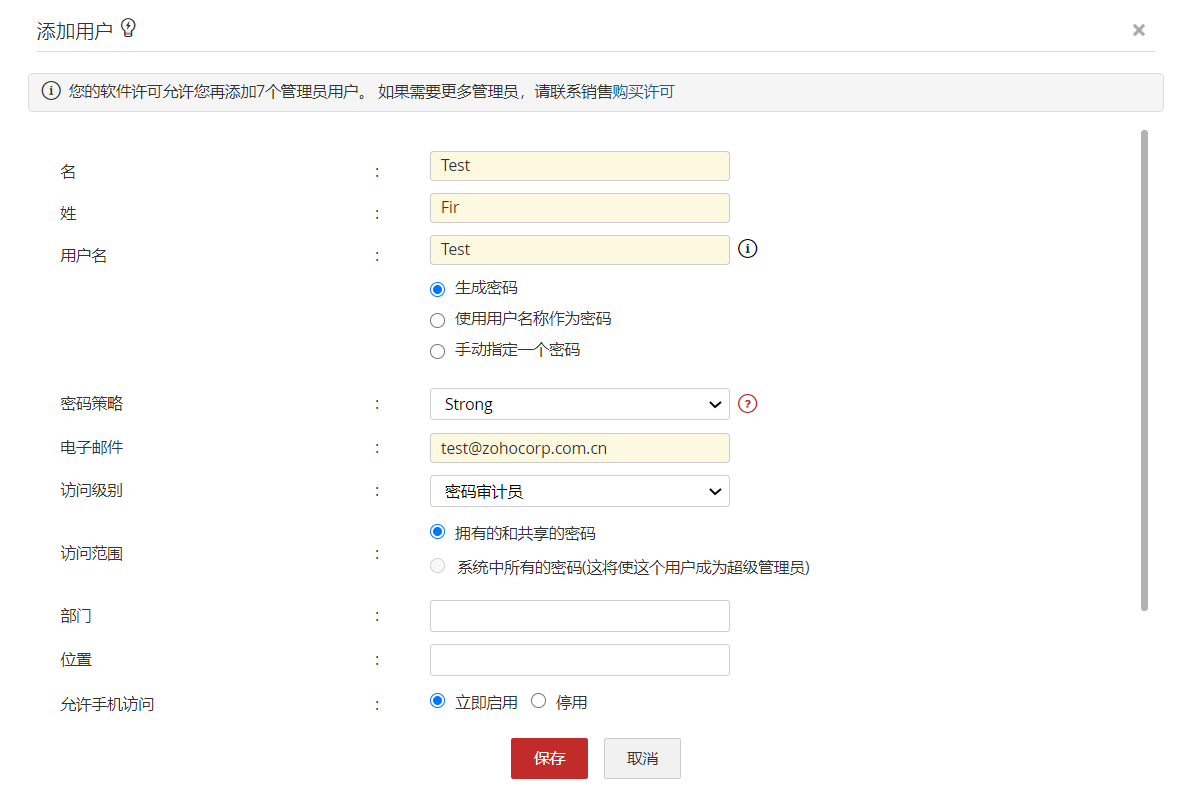 - 访问级别- 从下拉列表选项为用户选择访问级别,这将确定此用户在PAM360中的角色类型。