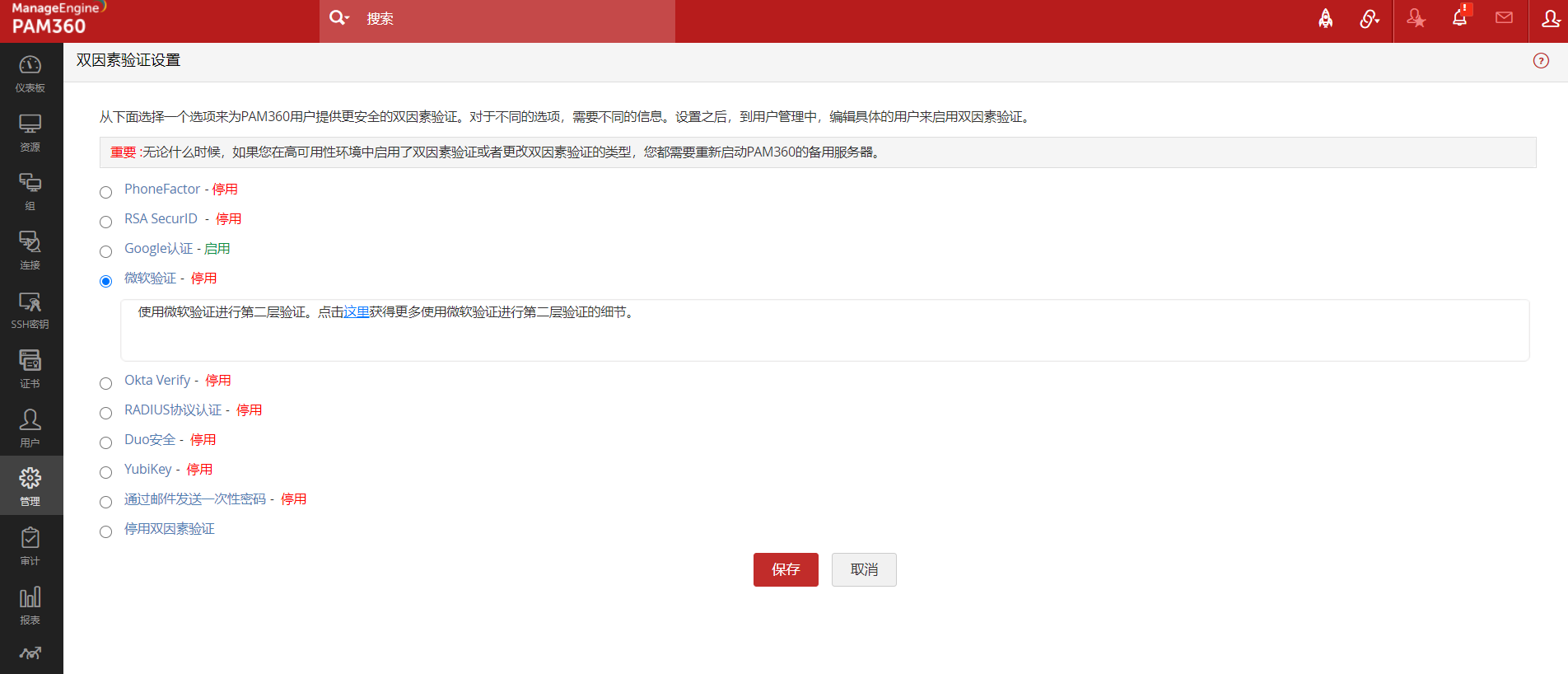 如果您已经配置了高可用性,那么无论开启双因素验证还是更改双因素验证类型(PhoneFactor、RSA SecurID、通过邮件发送一次性密码或Google身份验证),都需要重启PAM360辅助服务器。