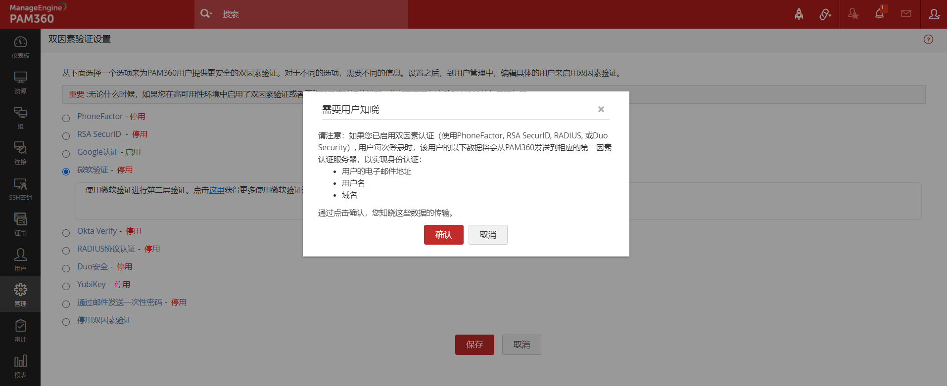 启用双因素验证的用户必须完成两次身份验证才能登陆到PAM360。 如上所述,第一级验证为常用验证。即,用户必须要完成PAM360本地、AD或LDAP验证。